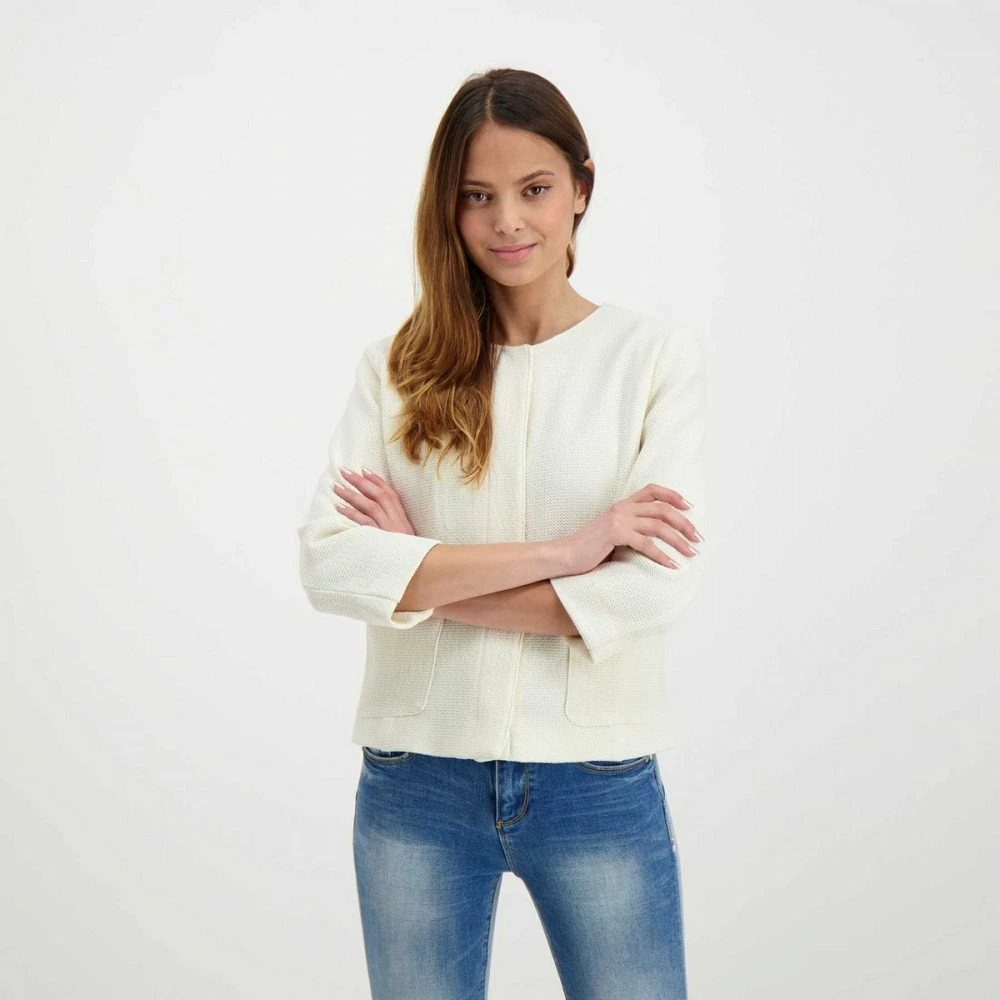 Realizzata in tessuto lavorato misto viscosa, Γ¨ caratterizzata dal taglio corto e dalla vestibilitΓ aderente a girocollo con maniche a tre quarti, chiusura nascosta con bottoni a pressione e tasche frontali.
