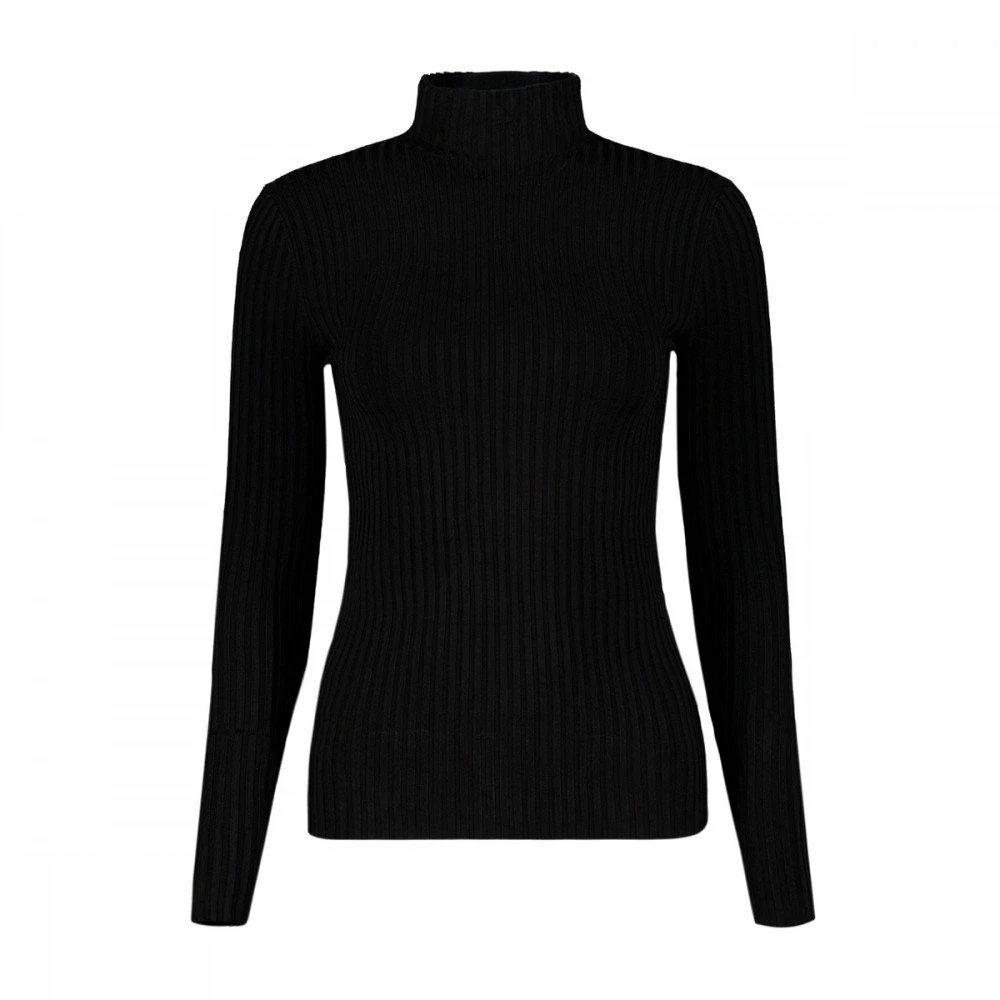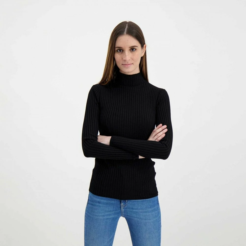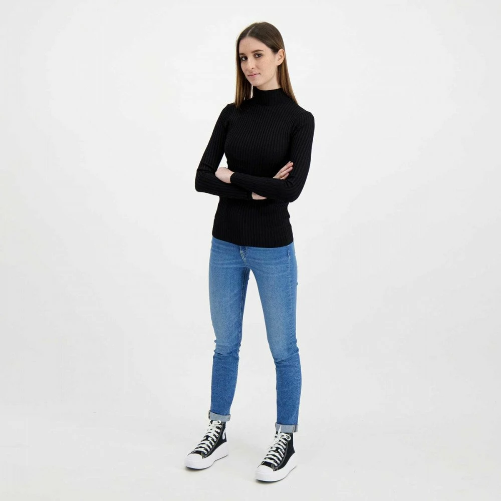 La maglia manica lunga Calvin Klein Back Logo Shiny da donna si distingue per il design aderente in viscosa, con lavorazione a coste e collo a lupetto, per un fit femminile che esalta la silhouette.