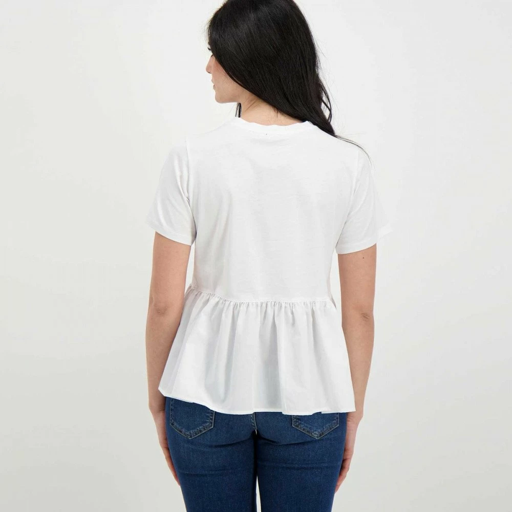 La t-shirt Emme Marella Racer da donna impreziosisce il classico modello girocollo con il fondo a balza, che crea un movimento armonioso e femminile.