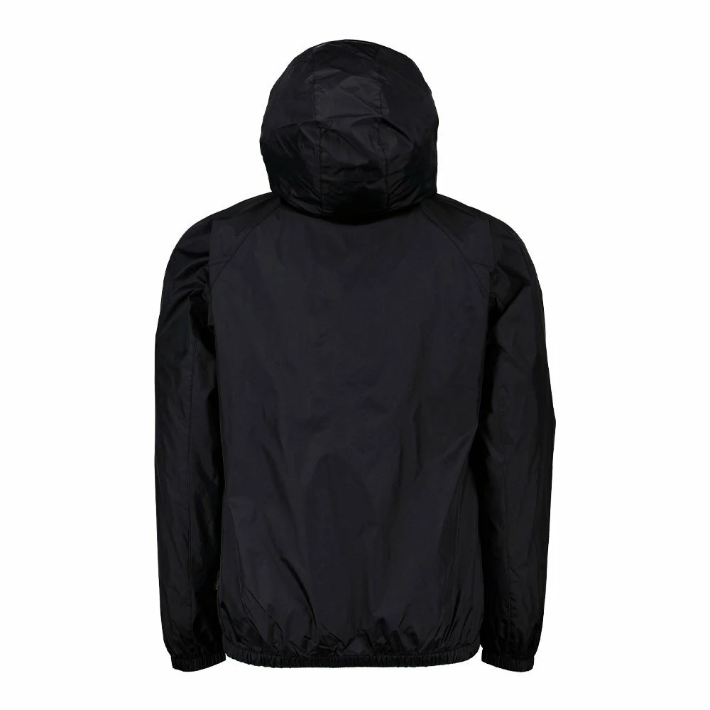 Vestibilità regular, è realizzata in nylon con chiusurafull zip, tasca a marsupio, bordi elasticizzati, cappuccio a collo altoe fodera interna in rete.